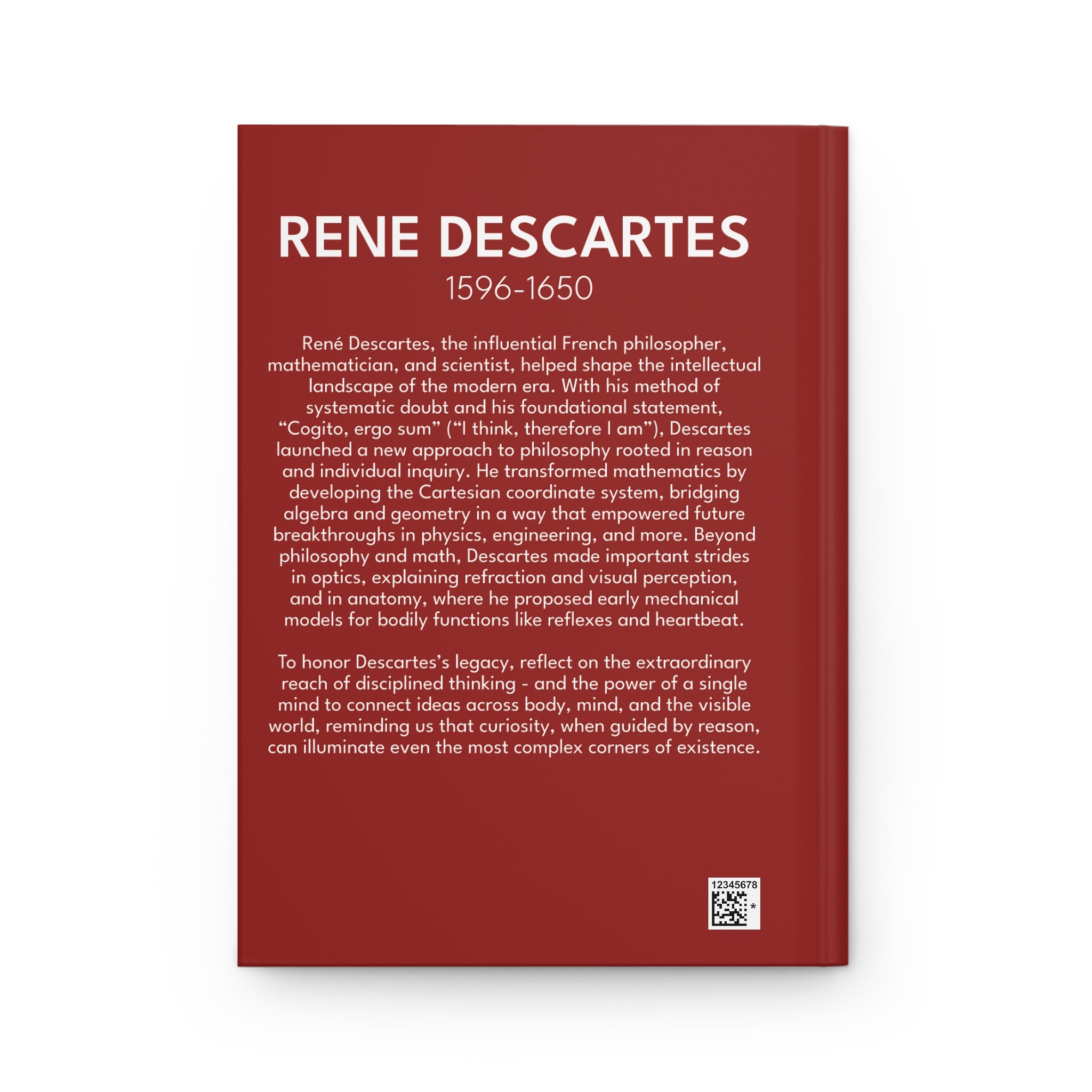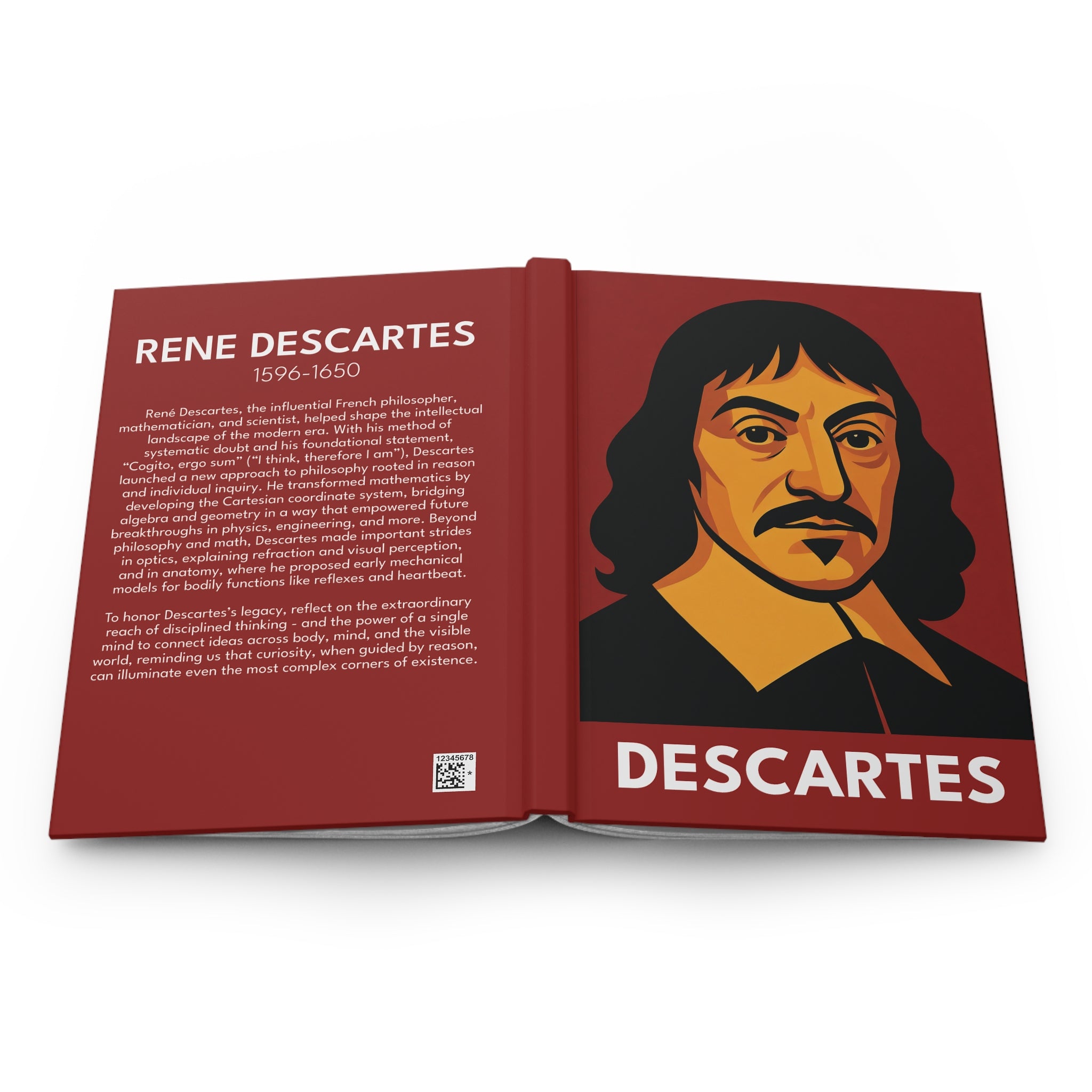 This Descartes hardcover journal features a bold, graphic portrait on the front cover and a biographical tribute on the back - the story of the man behind the art, printed where you'll see it every time you pick it up. Part of the Architects of Reason collection. Designed for the work of serious thinking - study sessions, research, reflection, the pursuit of questions worth asking.